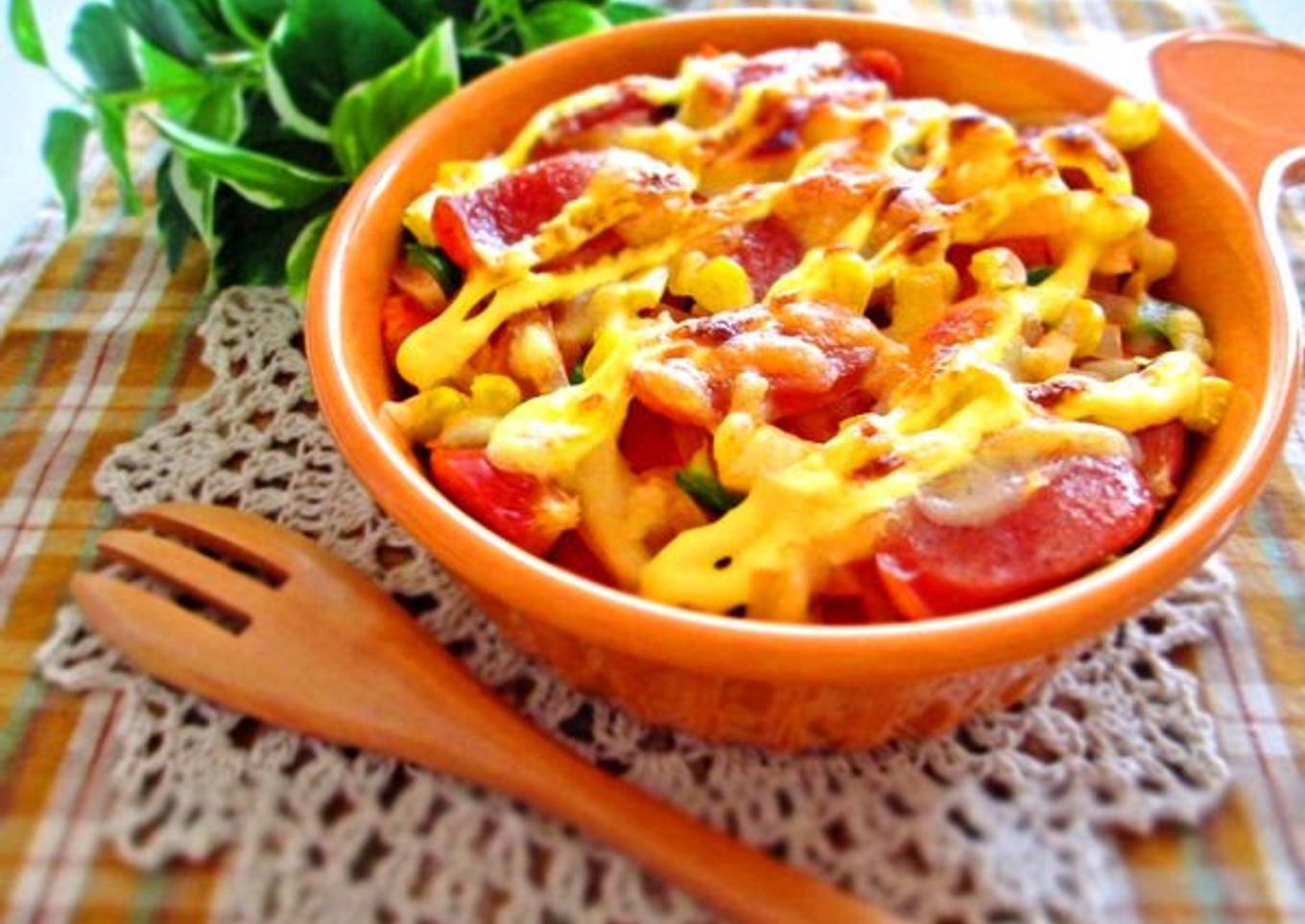 - 1 Potatoes, onions, green peppers, sausages, corn