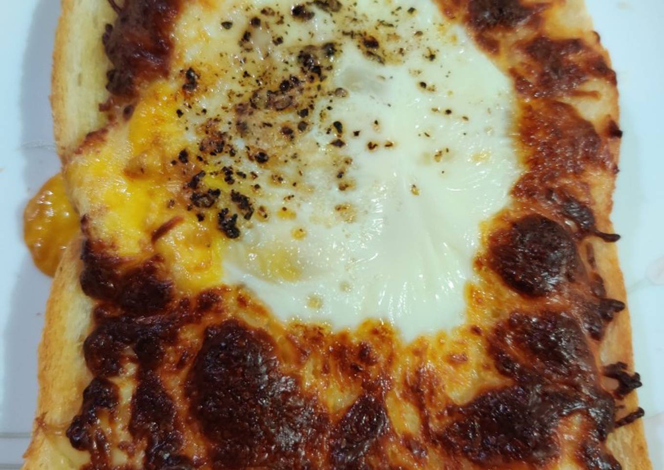 - Crack the egg into the centre of the bread. It should stay in the middle of the border of mayo and cheese. Season with salt and pepper.
