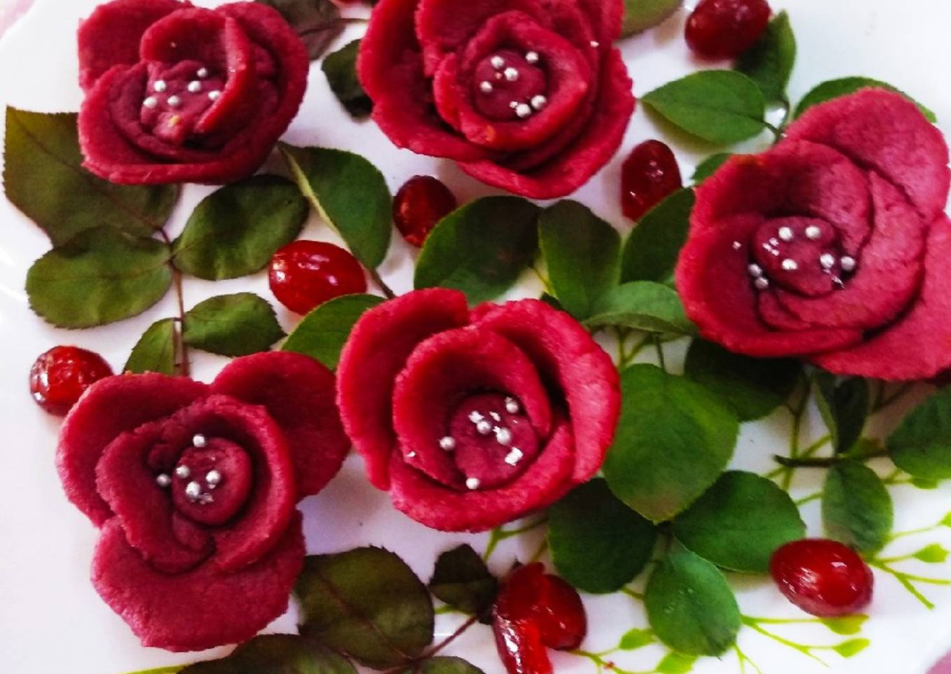 - Now roll dough on plastic and cut round pieces with cutter. Take one round fold and attach one by one make a shape like rose. Make small ball and press in middle.Put in a freeze for 1-2hr.So u will get dark red colour. Garnish with silver balls. Cherry and green leaves for garnishing. Healthy Delicious breakfast is ready to serve.