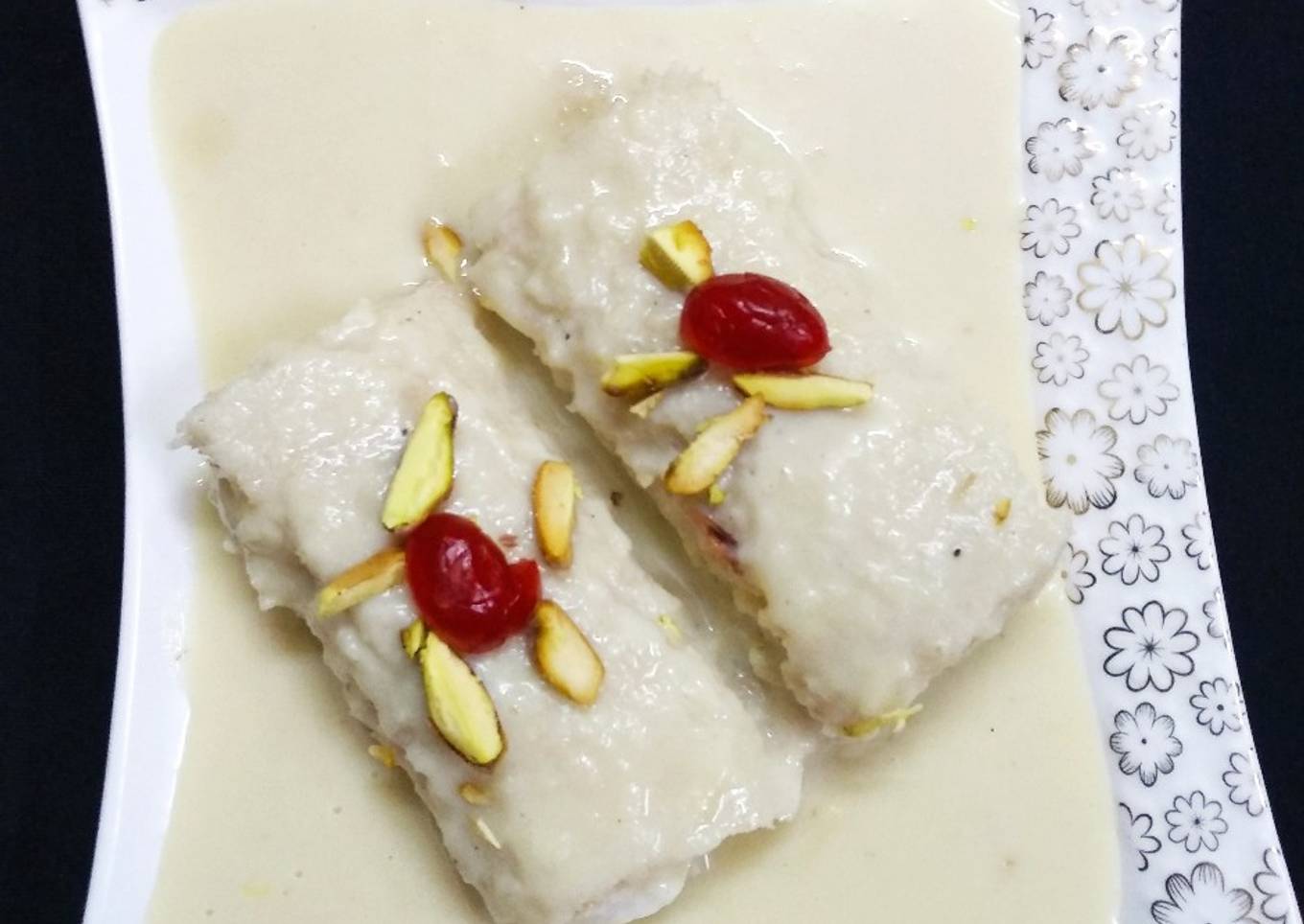 - Pour milk mixture on a bread roll. Garnish with pistachio and cherries. Serve chilled. Delicious Cream roll is ready to serve.