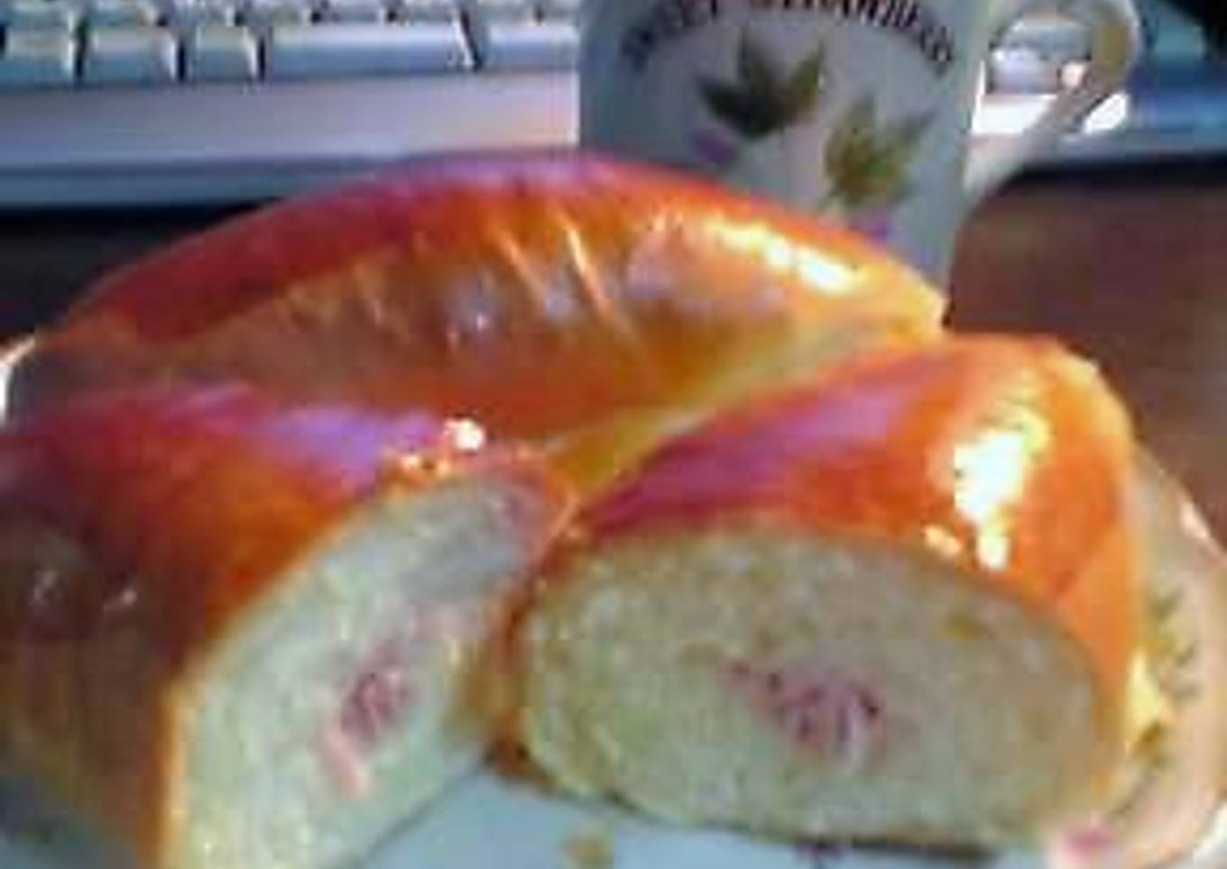 - Put the filling (ham) on the dough and roll up. Plate on the microwave turntable seam side down.
