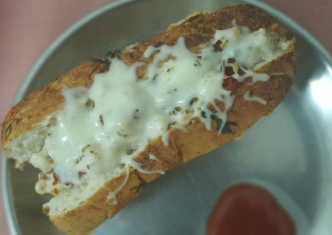 - Once the cheese melts and the bread is cripy at the bottom, remove it and serve with tomato ketchup.