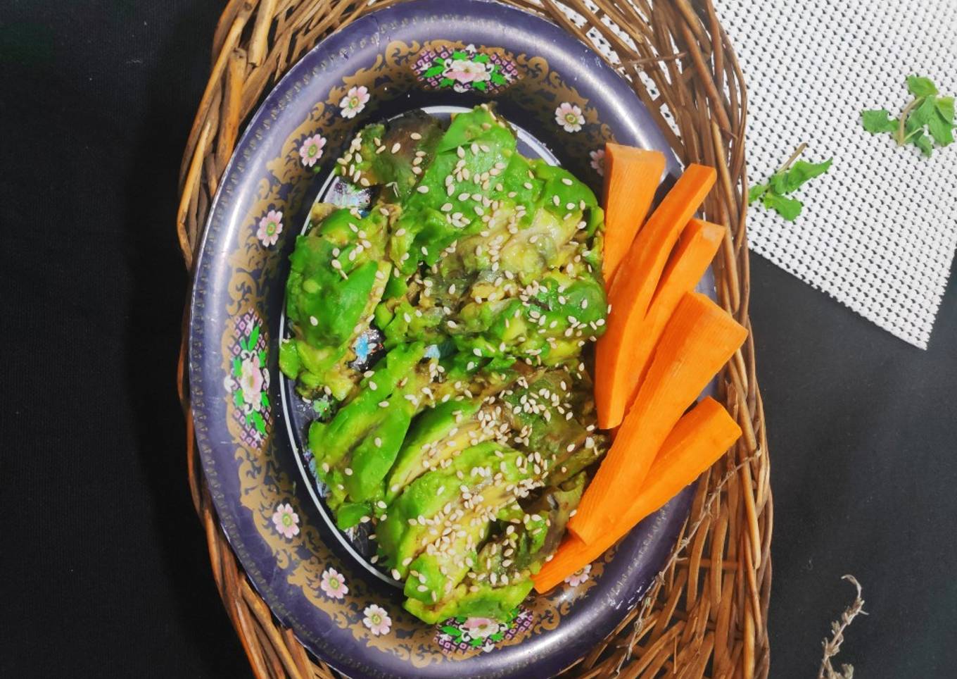 - Cut the avocado into slices, make sure you take a ripe avocado, drizzle little lime juice on it, sprinkle salt & sesame seeds and it's ready.